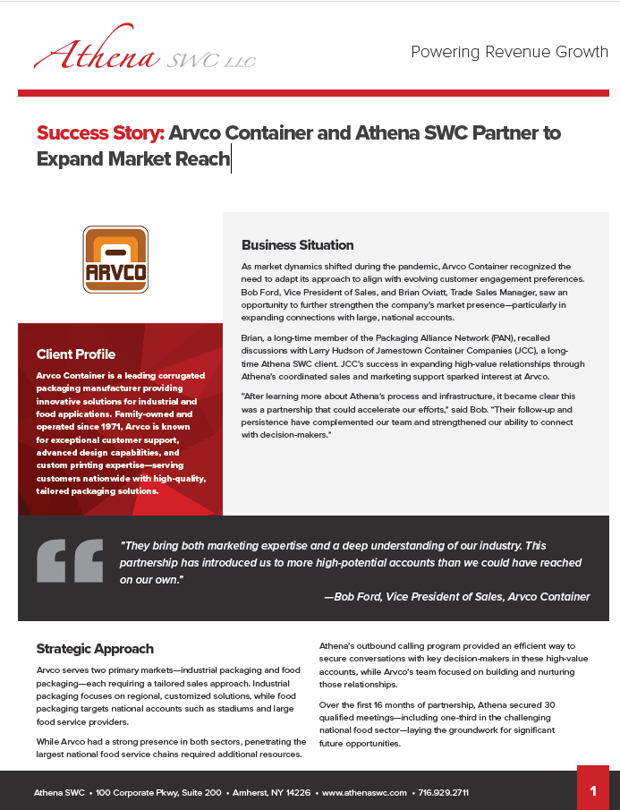 Athena SWC’s proven process model has succeeded in generating new business for manufacturers across the corrugated and folding carton, electronics, machine and equipment, medical, metals, plastic, plastic and flexographic packaging, professional services, technology, and thermal industries. But you don’t have to take our word for it — see the results of real-life initiatives in several manufacturing industries below.